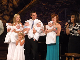 The Jones 8 and our little entourage made our way back to Riverbend Church yesterday to kick off the diaper drive they are hosting for us this month. Man, it was great to be back! We are really looking forward to the day when we can make more regular Sunday morning appearances, but yesterday made it clear that we are not quite ready for that! It took four adult helpers (thank you, Stevie, Michelle, Tricia, and Avery!) to help get The Fab Five primped, prepped, stuffed, and buffed for their big appearance on stage! Imagine getting five babies bottled, changed, dressed, fed breakfast, calmed, and buckled into their car seats in a little less than an hour and then you can imagine why it took so much help…and oh yeah, me, Casey, and Eliot still had to manage to get ready at the same time..aaaaagggghhhh!! In spite of the chaos, the event went great – Riverbend is always so good to us! We skipped their morning naps, but the babies did not seem to notice (no meltdowns and no crying on stage!) and Eliot played the role of Superstar Big Sis better than ever!